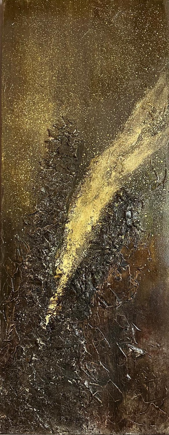 Vor einem tiefschwarzen Hintergrund breitet sich unten eine dunkle Struktur aus – sie erinnert an Erde, Holz oder vielleicht an eine verbrannte Oberfläche. Aus dieser dunklen Basis bricht schräg nach oben rechts eine längliche, goldene Blüte hervor. Ihre Form scheint kraftvoll und zugleich zart, als würde sie sich trotz des Widerstands ihren Weg ans Licht bahnen.